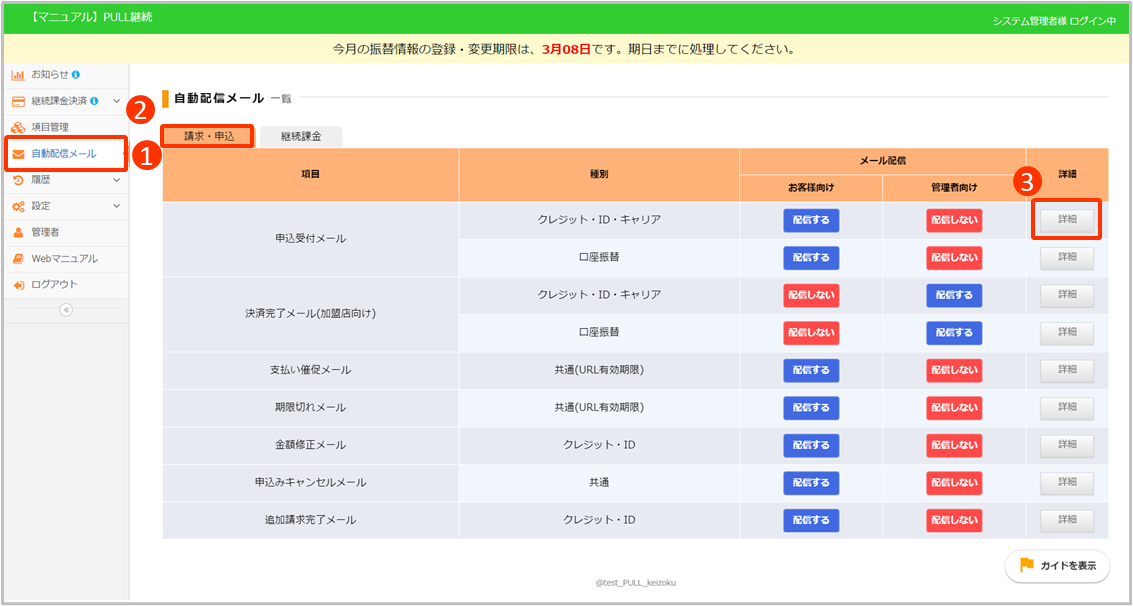 | 登録完了メール | お客様にて継続課金の登録が完了した際に配信されるメール | 詳細 |