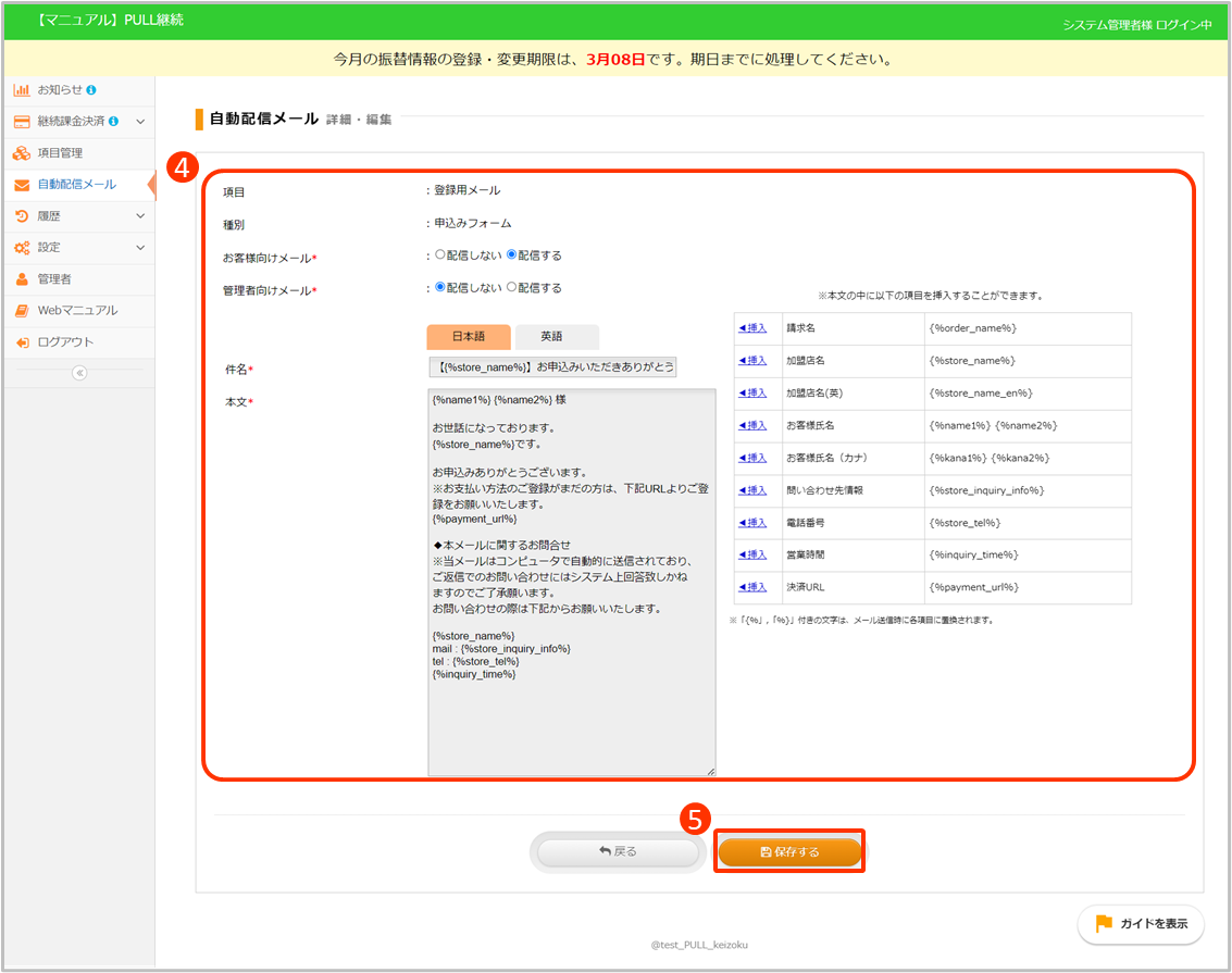 | 未登録時リマインドメール | 口座振替登録に失敗した際、お客様へ配信されるメール | 詳細 |