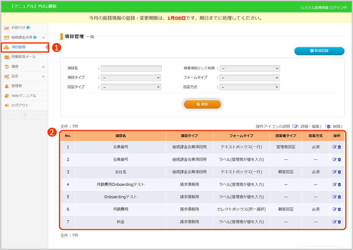 | 項目タイプ | 請求情報用、継続課金会員用 |