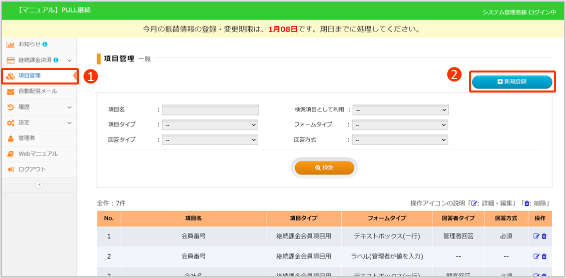 継続課金会員用で作成した項目は[会員管理-詳細]で編集ができます。