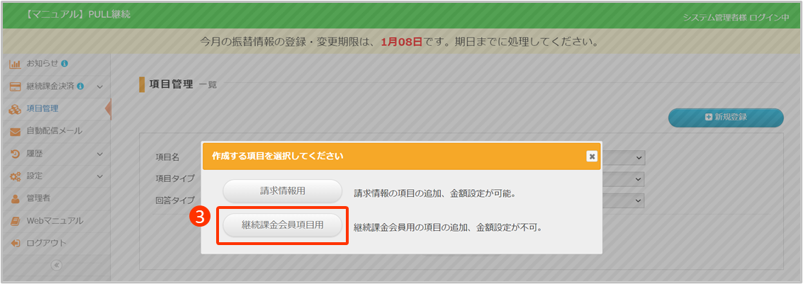 ③[継続課金会員項目用]をクリック