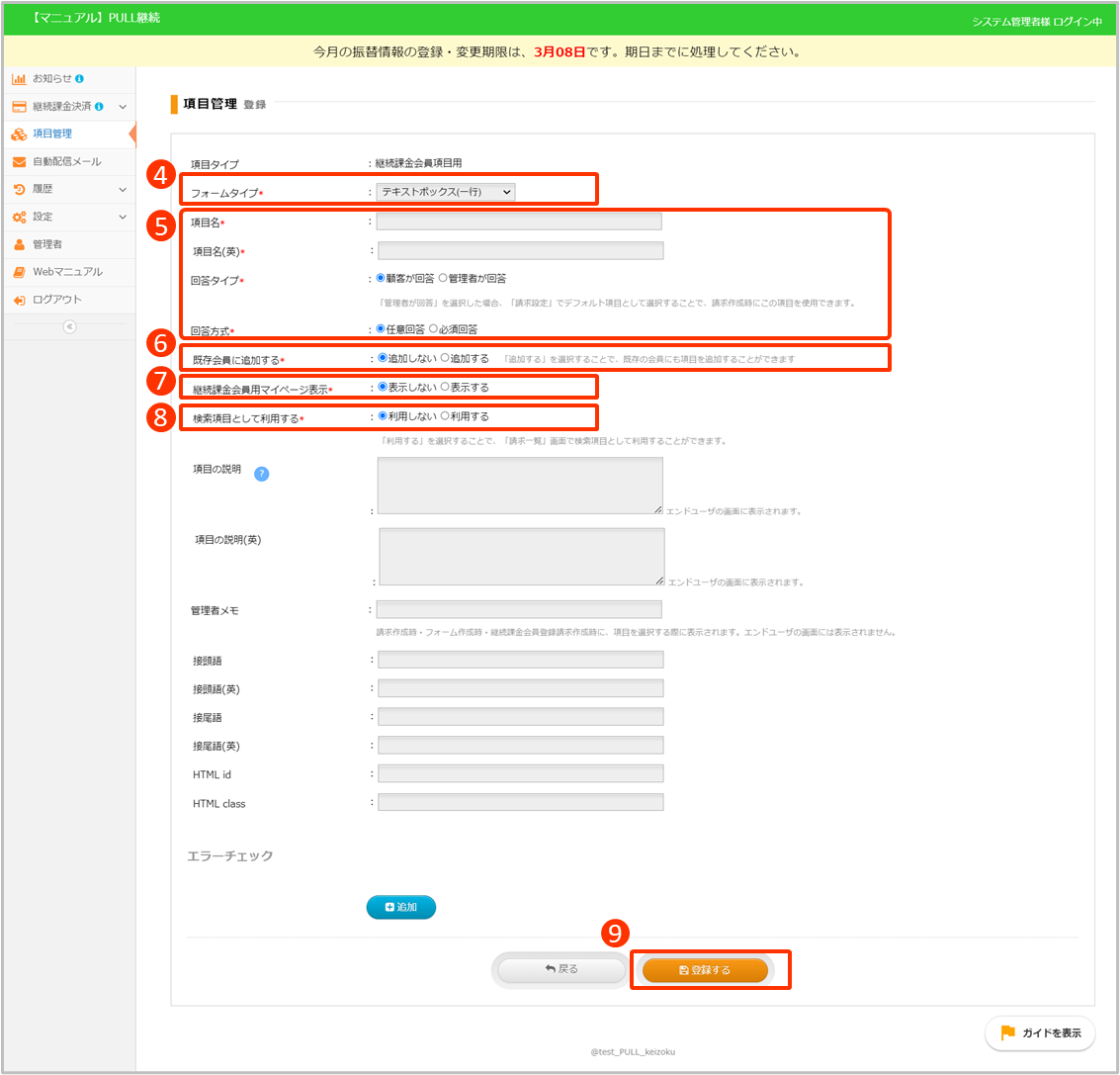 ⑥既存会員にも項目を追加するかどうかを選択