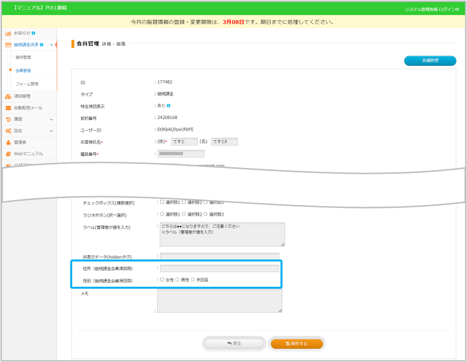 【反映例:会員管理-詳細 継続課金会員用項目】