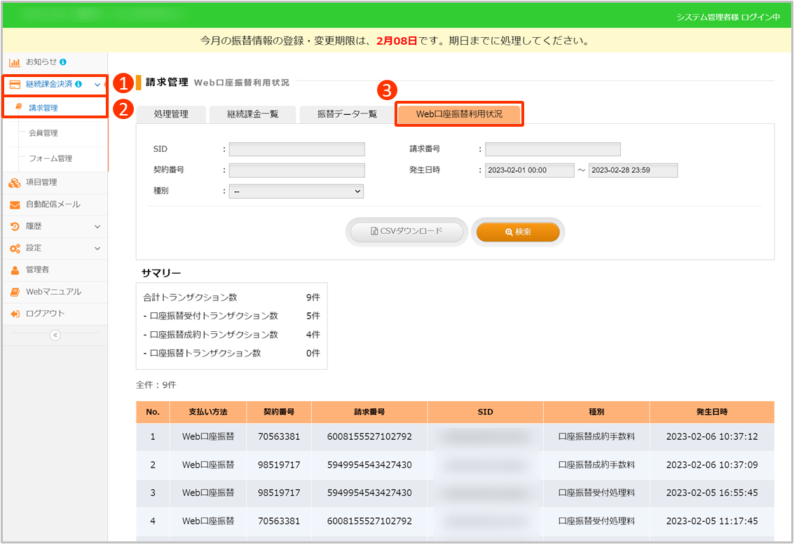 ・口座振替受付、口座振替成約、口座振替データのCSVダウンロード