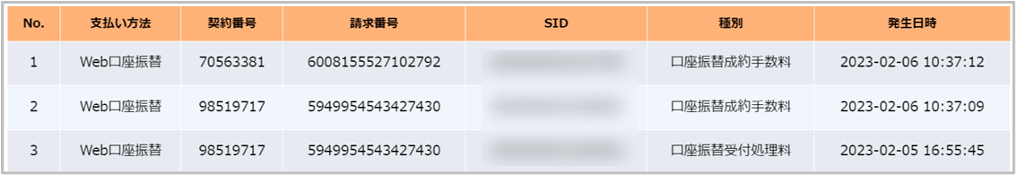 | 種別 | 口座振替トランザクションの種別 [口座振替受付処理料] …口座登録の成否にかかわらず、 登録する金融機関の選択画面に遷移した時点で発生するトランザクション [口座振替成約手数料] …口座登録が成功した際に発生するトランザクション [口座振替手数料] …振替の成否に関わらず発生するトランザクション |