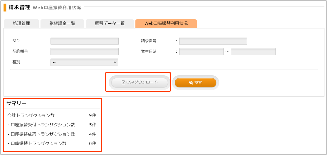 ・サマリーにて口座振替受付、口座振替成約、口座振替のトランザクション件数の確認