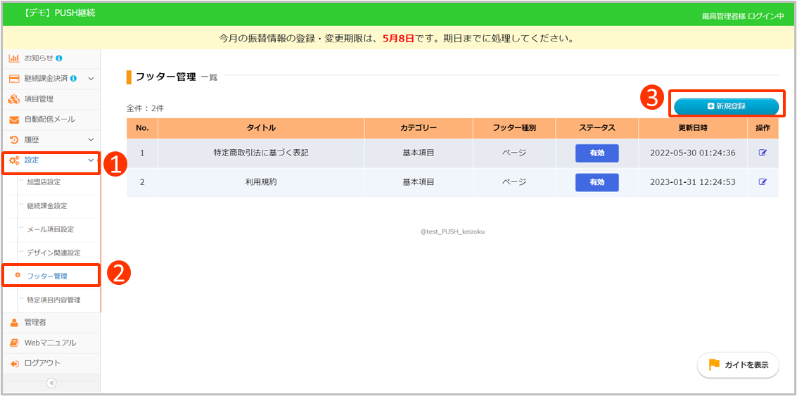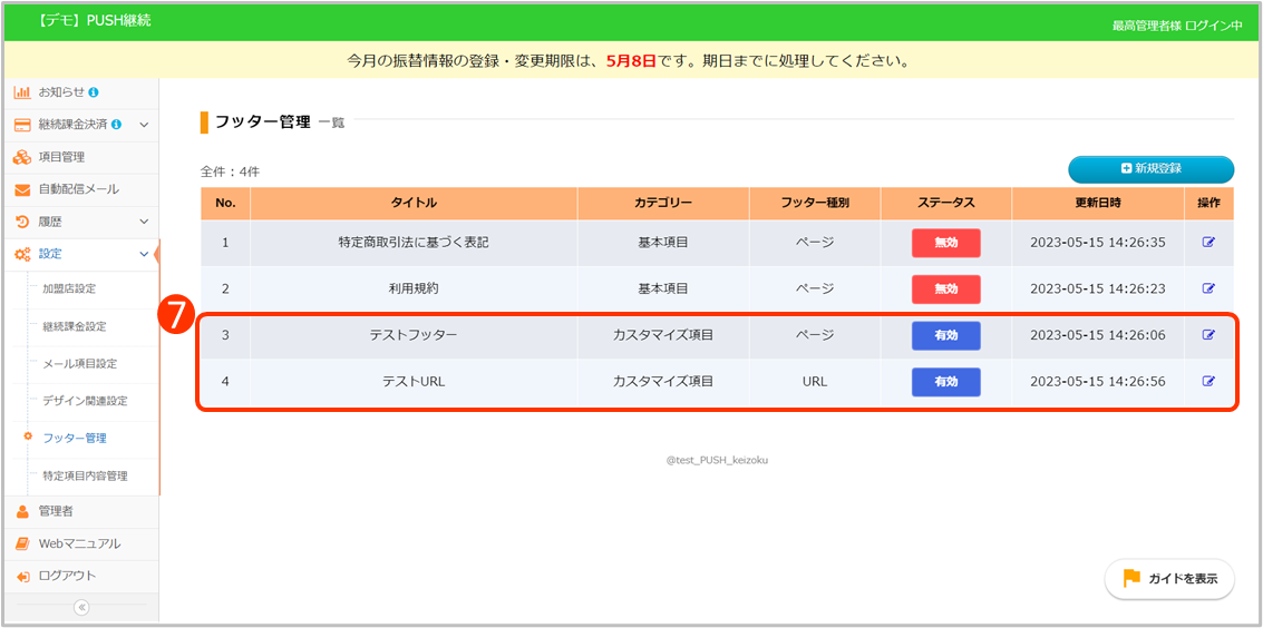 [操作]の詳細アイコンをクリックし、作成したフッターの編集や