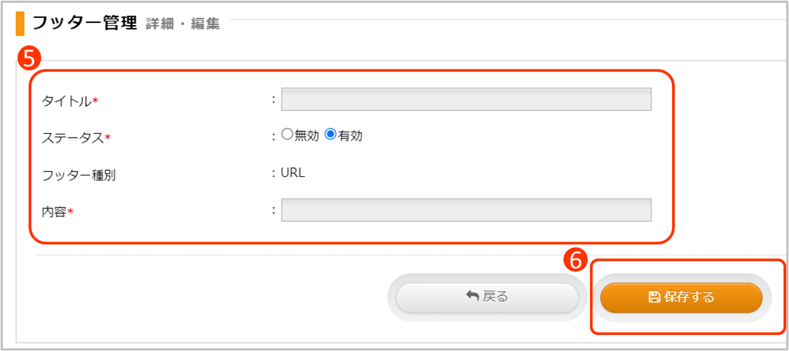 フッター種別がページの場合:表示する内容を入力します フッター種別がURLの場合:指定のURLを入力します |