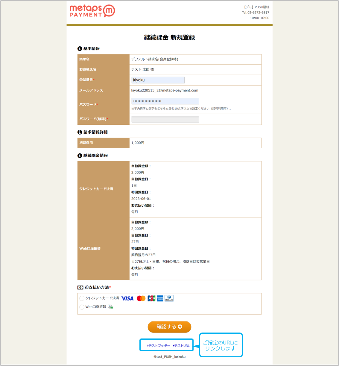 お客様画面内に特定商取引法に基づく表記のページや利用規約の作成や、貴社サイト内のページへのリンク作成が可能です。