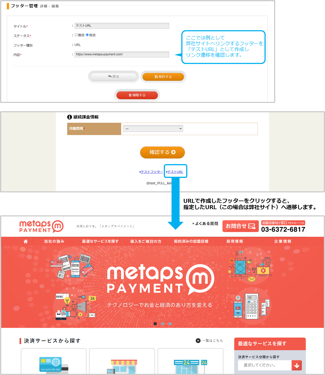「URL」を選択した場合は、ご希望のURLへのリンクをフッターに作成します。