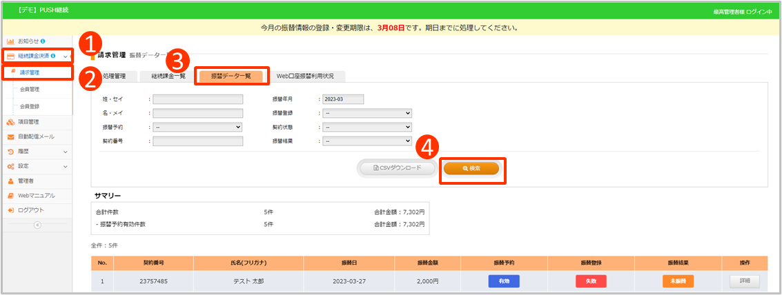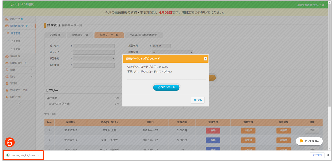 振替データ一覧のCSVダウンロードが可能です。