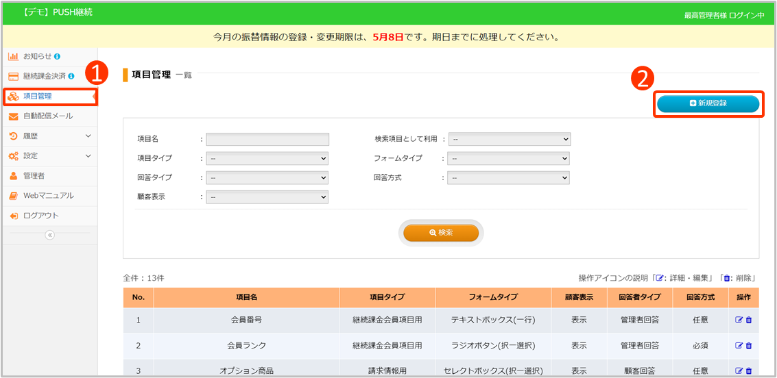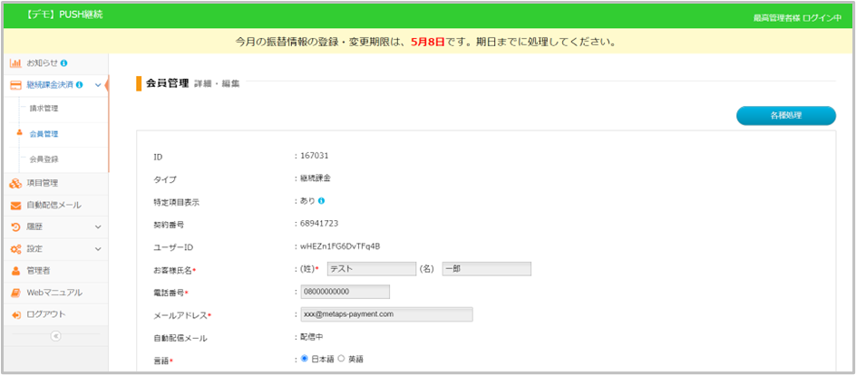 継続課金会員用で作成した項目は[会員管理-詳細]で編集ができます。