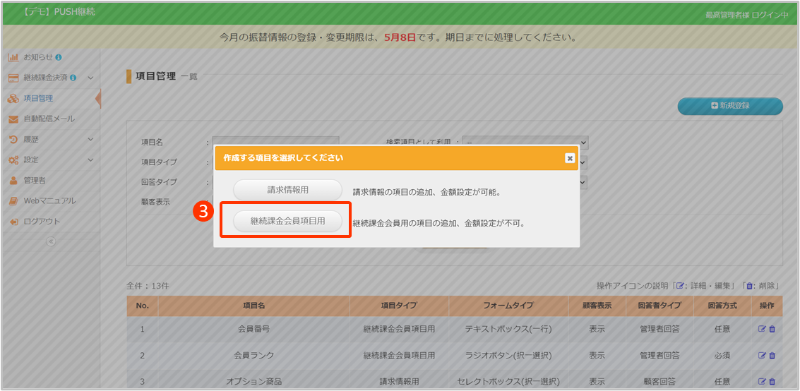 ③[継続課金会員項目用]をクリック
