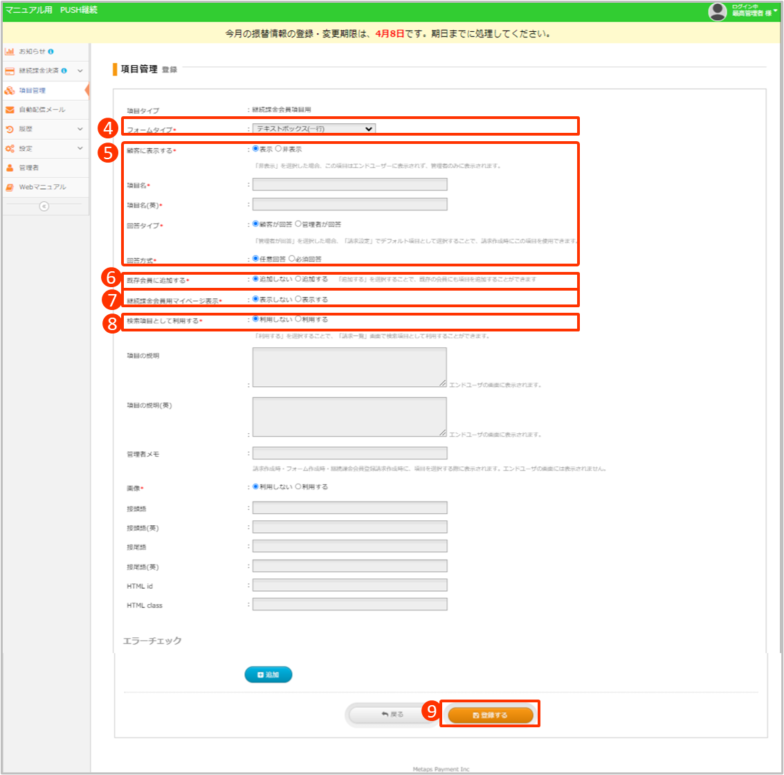 ⑥既存会員にも項目を追加するかどうかを選択