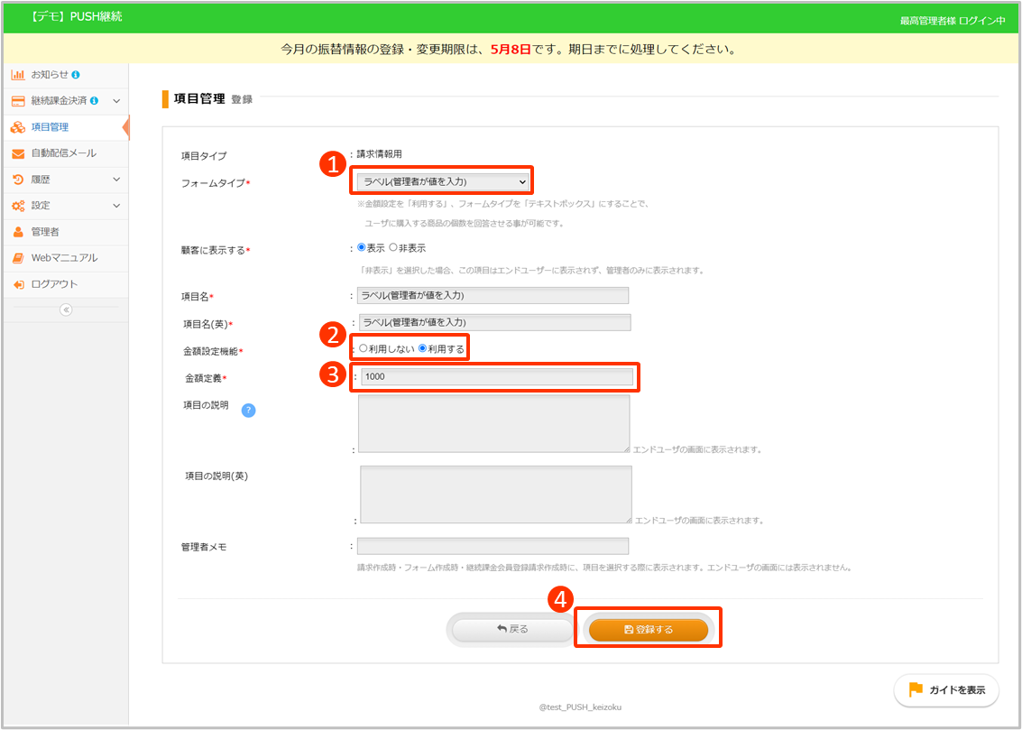項目管理-[ラベル(管理者が値を入力)] 2024年04月24日 01:47 更新 【ラベル(管理者が値を入力)】加盟店様が指定する金額を表示させる項目を作成できます。■設定方法項目 詳細編集はこちらから詳細をご確認できます。 ①ラベル(管理者が値を入力) を選択②金額設定機能[利用する]を選択③金額定義に金額を入力④[登録する]をクリック 項目に画像を設定する場合はこちらを参照ください。 他にご質問がございましたら、リクエストを送信してください ページの先頭へ戻る