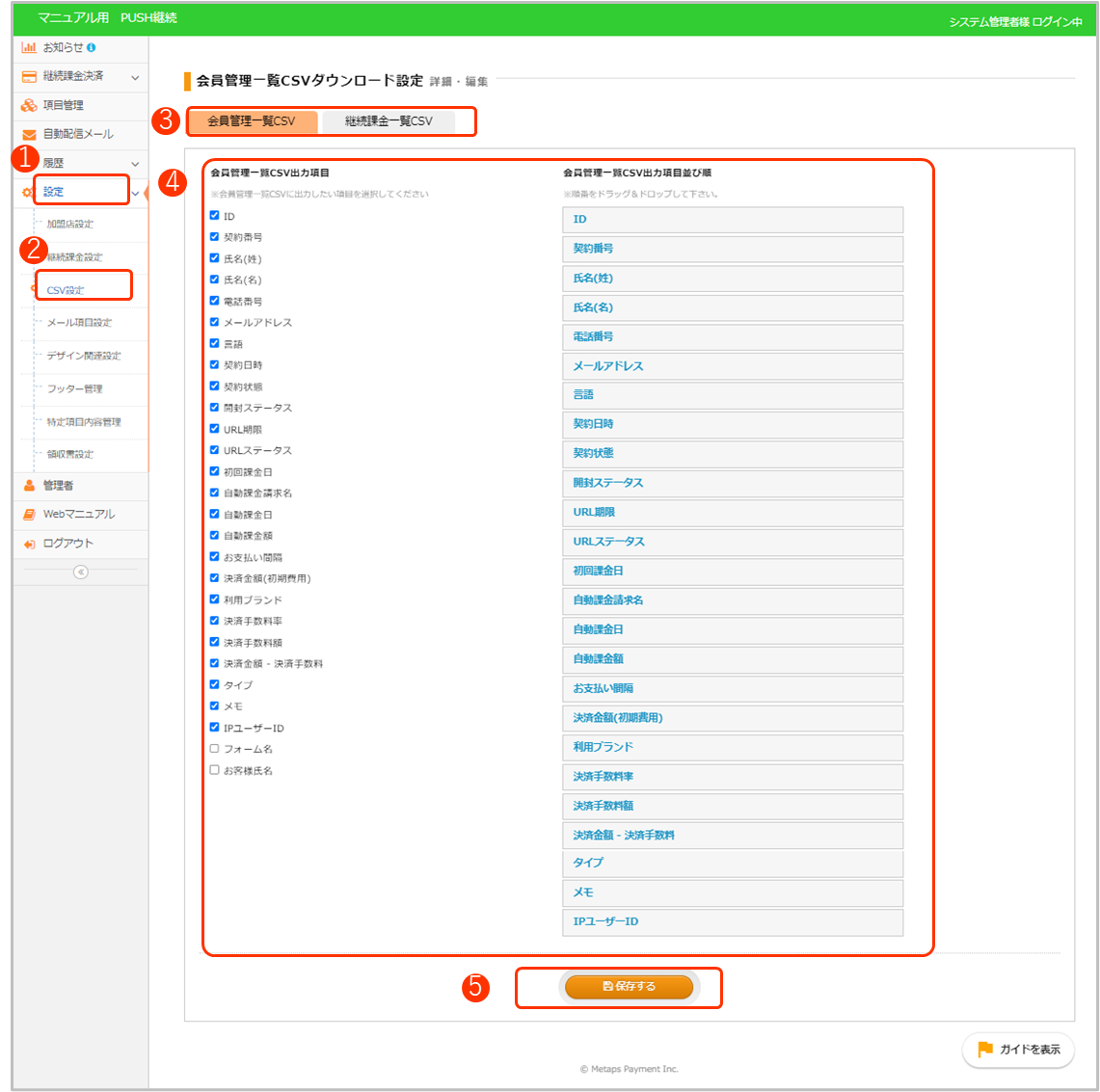 ダウンロード箇所:継続課金決済 - 会員管理 - CSVダウンロード
