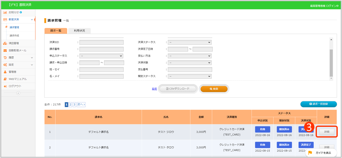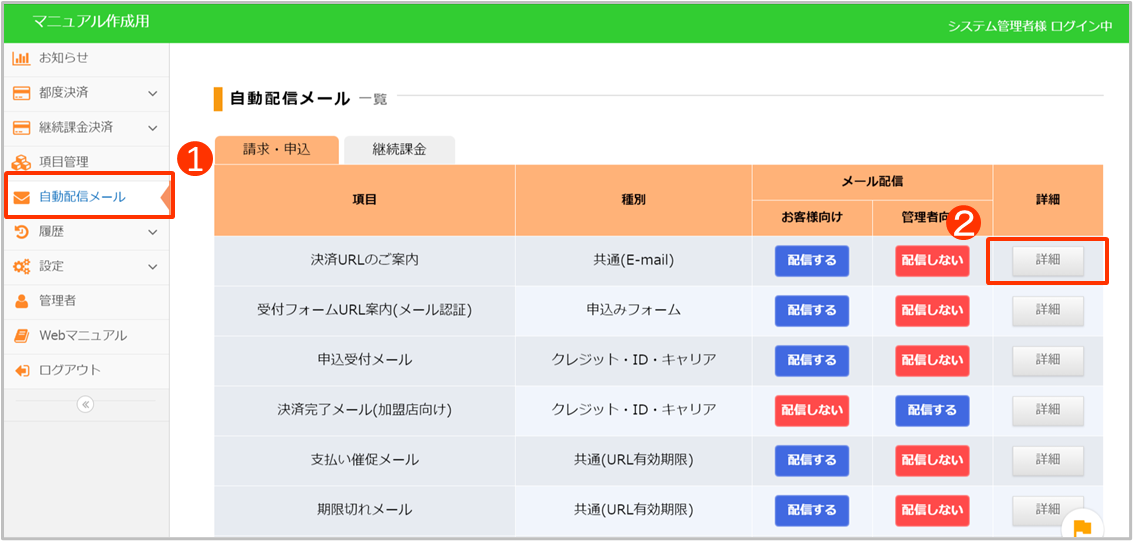 ②[決済URLのご案内(共通 E-mail)]の[詳細]をクリック