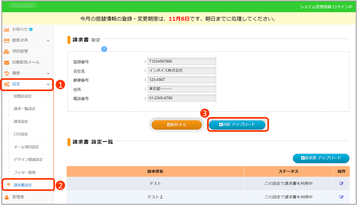 ⑪請求書設定/編集 画面の最下部までスクロールし、[表示する]にチェック