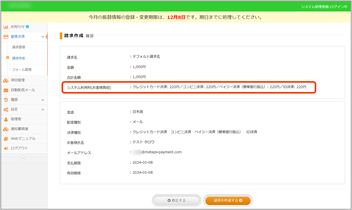[請求作成時の確認画面(システム利用料をお客様負担)]