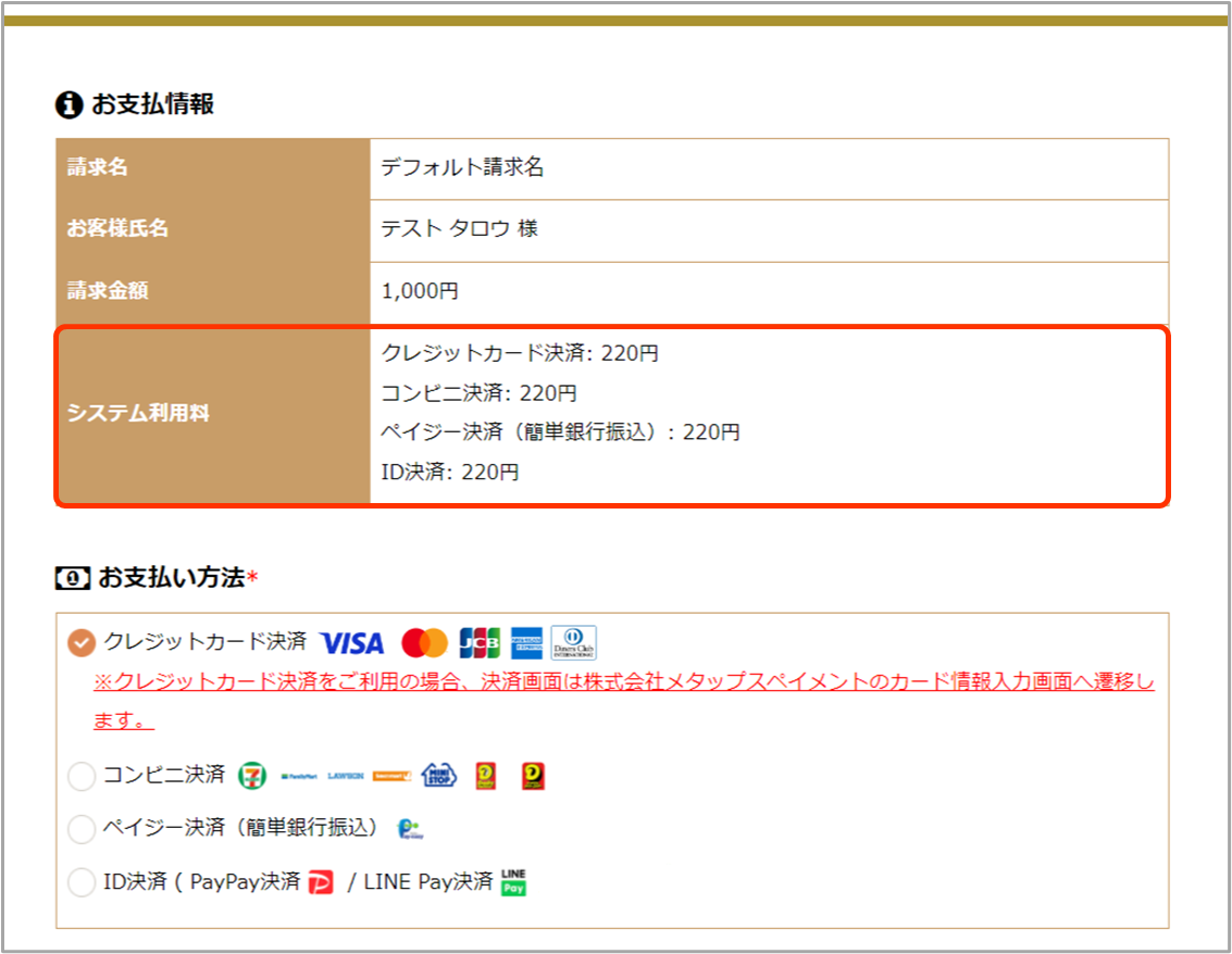 お客様のお支払い画面にシステム利用料が表示されます。
