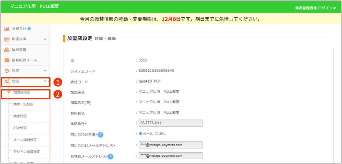 ②[加盟店設定]をクリック