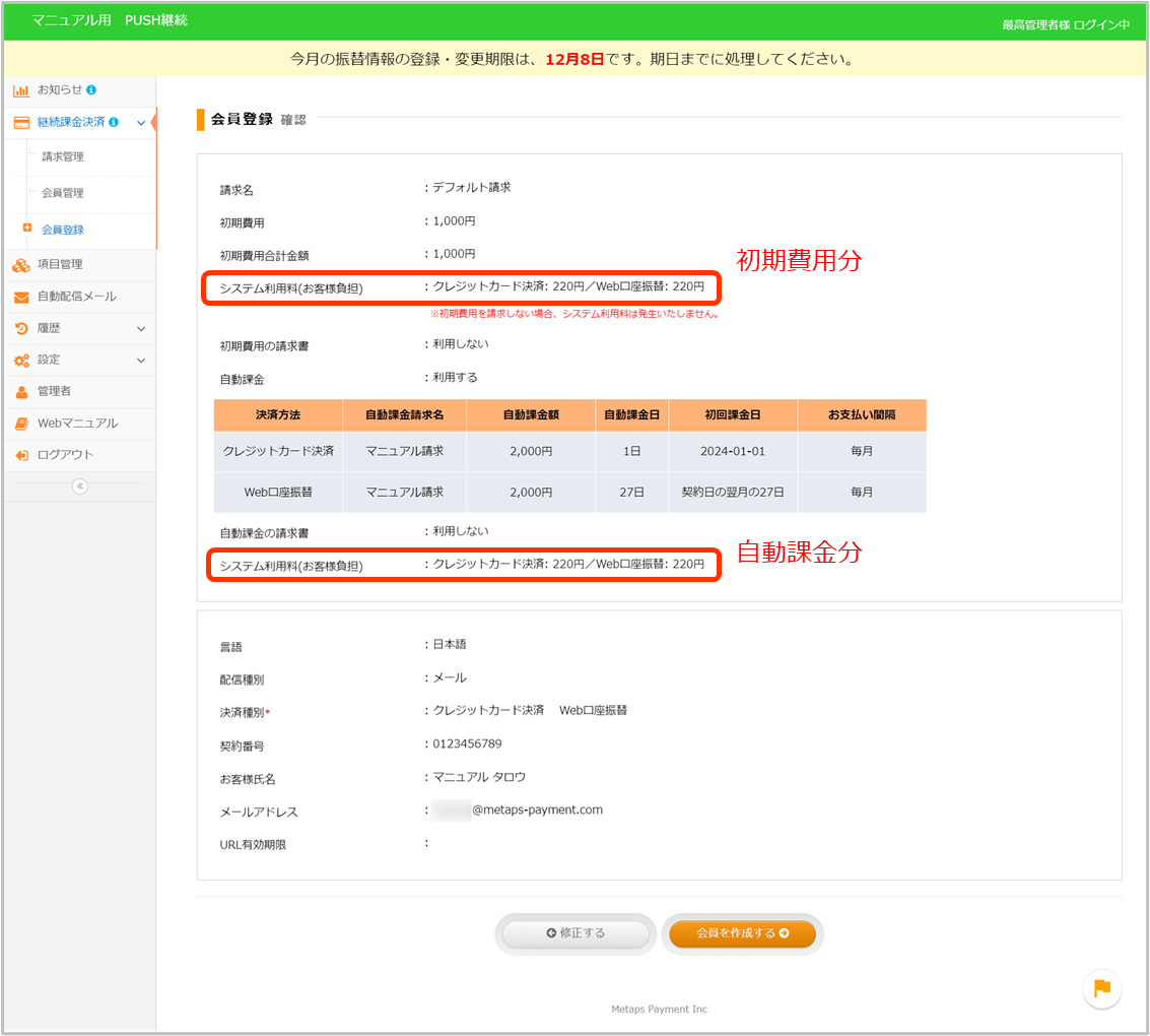 会員登録作成時の確認画面に初期費用、自動課金分のシステム利用料が表示されます