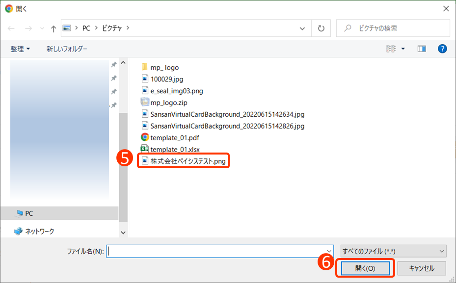 ⑥[開く]をクリック