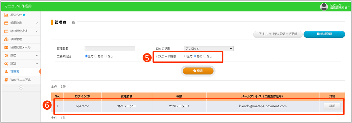 管理者-パスワード有効期限の設定 2024年03月25日 04:40 更新 ログイン時に必要なパスワードの有効期限を設定することが可能です。※パスワードの有効期限は90日に設定されております。■操作方法①[管理者]をクリック②[パスワード有効期限を設定する]に変更③[保存する]をクリック④[一覧へ]をクリック ⑤検索にて[パスワード有効期限]をありに選択⑥[パスワード有効期限あり]設定のアカウントが表示されます。 他にご質問がございましたら、リクエストを送信してください ページの先頭へ戻る