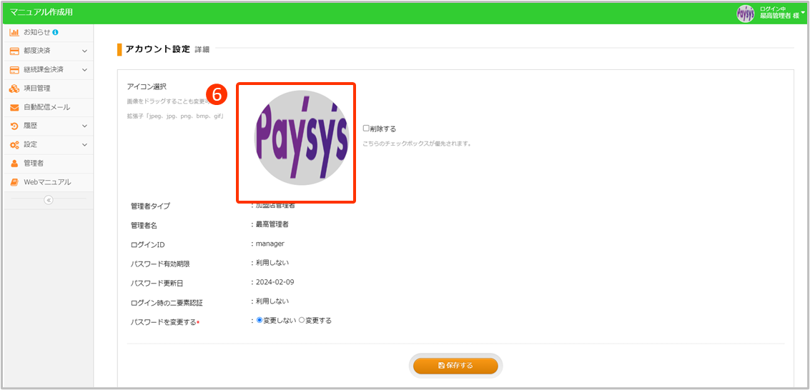 | 管理者名 | ログイン時、画面右上に表示される管理者名 |