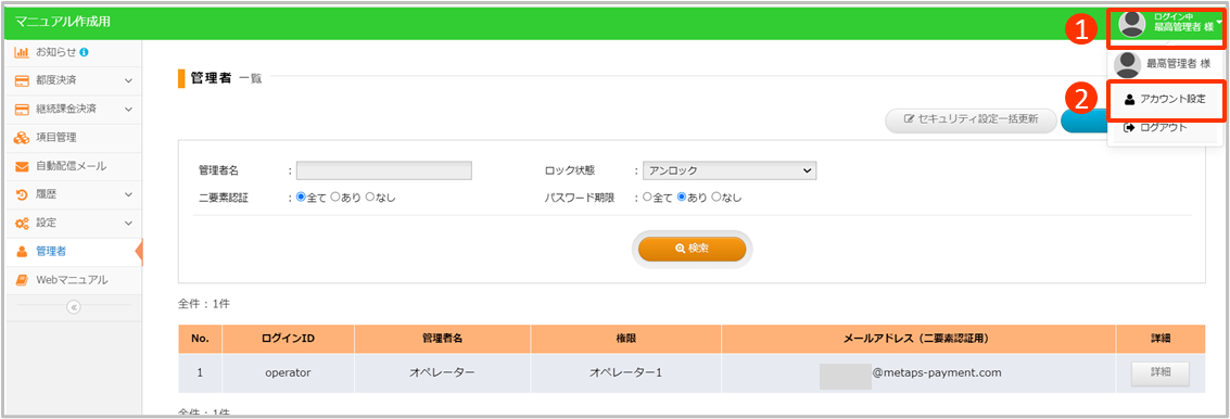 | 管理者名 | ログイン時、画面右上に表示される管理者名 |