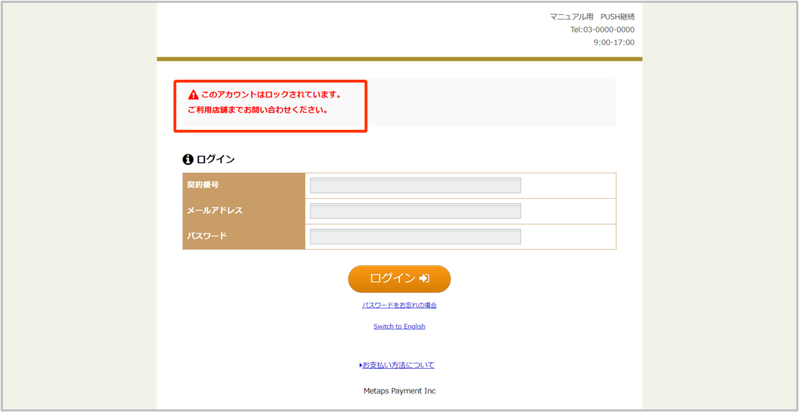 アカウントがロックされた場合、1時間お待ちいただくか、加盟店様によるアカウントのロック解除が必要となります。