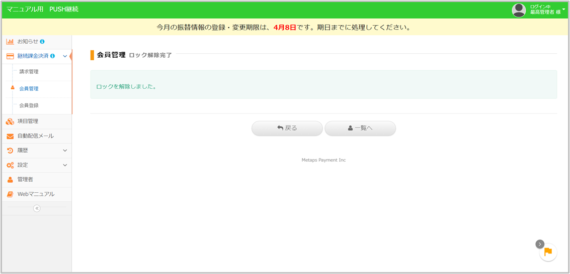アカウントがロックされた場合、1時間お待ちいただくか、加盟店様によるアカウントのロック解除が必要となります。