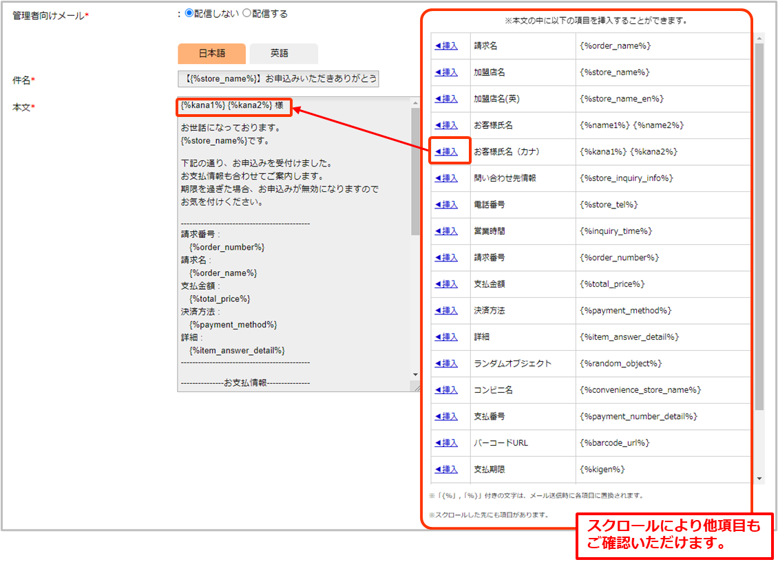 「お客様名(カナ)」 {%kana1%} {%kana2%}の可変項目を挿入