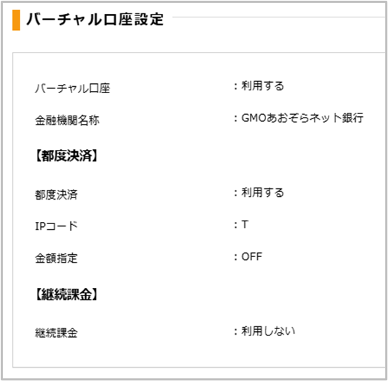 | 都度決済 | 都度決済におけるバーチャル口座の利用有無 |