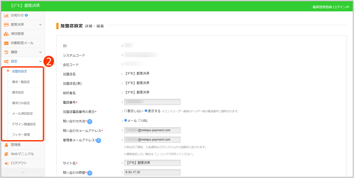 加盟店様情報、請求に関する設定の確認、変更が可能です。