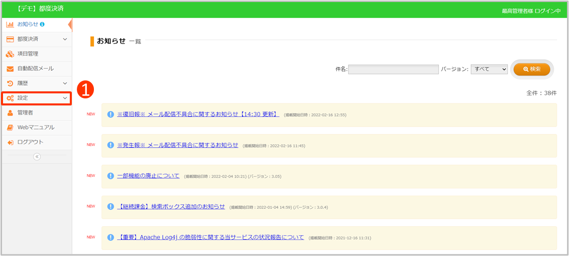 | メール項目設定 | 決済URLのご案内(※請求用)、継続課金登録用メールの 編集画面に表示する項目の設定 |