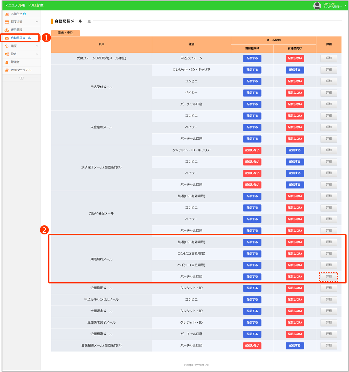 ②[期限切れメール]の[バーチャル口座]の[詳細]をクリック