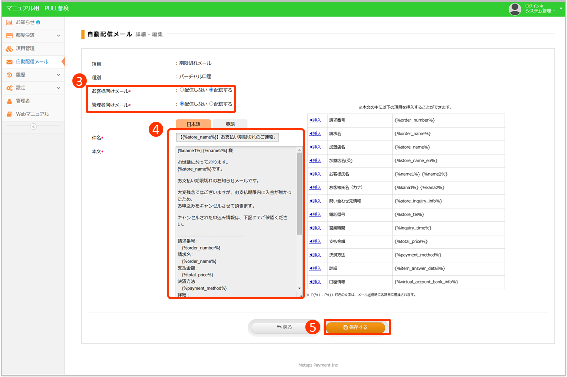 | 種別 | 編集中のメールの対象決済種別の表示 |