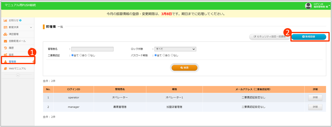 | 管理者名 | ログイン時、画面右上に表示される管理者名 |