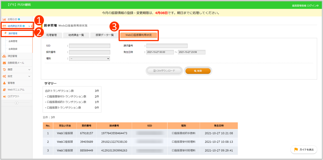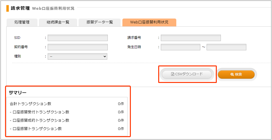 ・サマリーにて口座振替受付、口座振替成約、口座振替のトランザクション数の確認