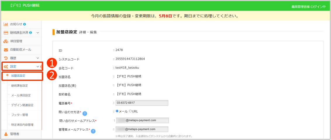 ②[加盟店設定]をクリック