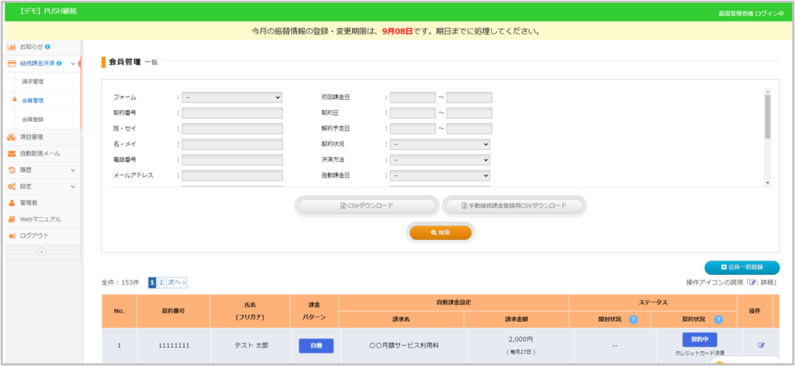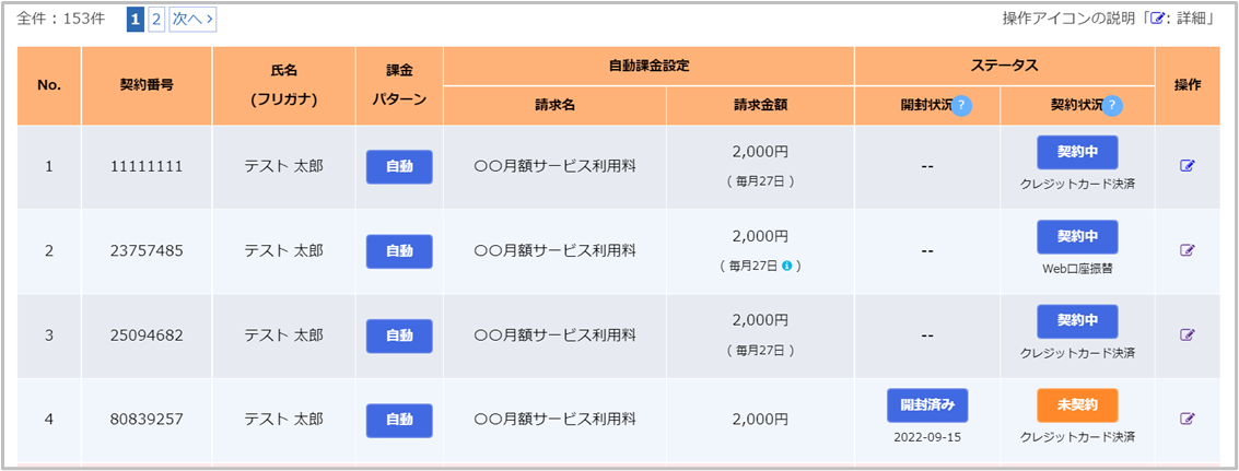 | 操作 | 該当の会員の詳細画面や手続き画面へのリンクボタン 下記の会員の管理が行えます。(操作できる処理の内容は契約状況や決済種別により異なります。) ・会員情報の詳細確認、編集 ・会員の削除 ・会員再作成 ・個別請求 ・クレジットカード変更手続き ・会員の解約(クレジットカード会員の場合) ・会員の解約(WEB口座振替会員の場合) ・課金パターン変更 ・会員に紐づく項目の設定機能 - 会員毎に設定する方法 ・会員に紐づく項目の設定機能 - 一括設定方法 |
