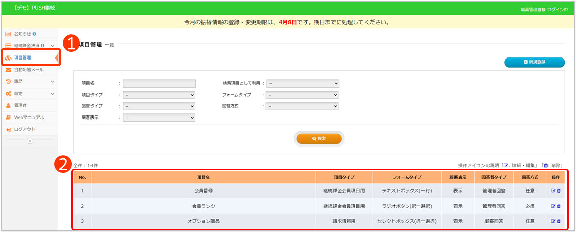 ・継続課金会員用の項目の新規登録についてはこちら(金額設定不可)