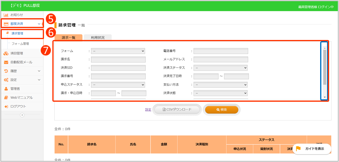 請求一覧設定 2023年07月25日 03:25 更新 [請求管理 一覧]の検索用項目の設定が可能です。 ■操作方法 ①[設定] をクリック②[請求一覧設定]をクリック③[請求一覧設定]から検索に利用したい項目にチェック④[保存する]をクリック ⑤[都度決済]をクリック⑥[請求管理]をクリック⑦[請求管理 一覧]の検索項目欄に[請求一覧設定]でチェックした項目が反映されているか確認 すべての項目を確認する際は画面右のスクロールバーをスライドしてください。 他にご質問がございましたら、リクエストを送信してください ページの先頭へ戻る