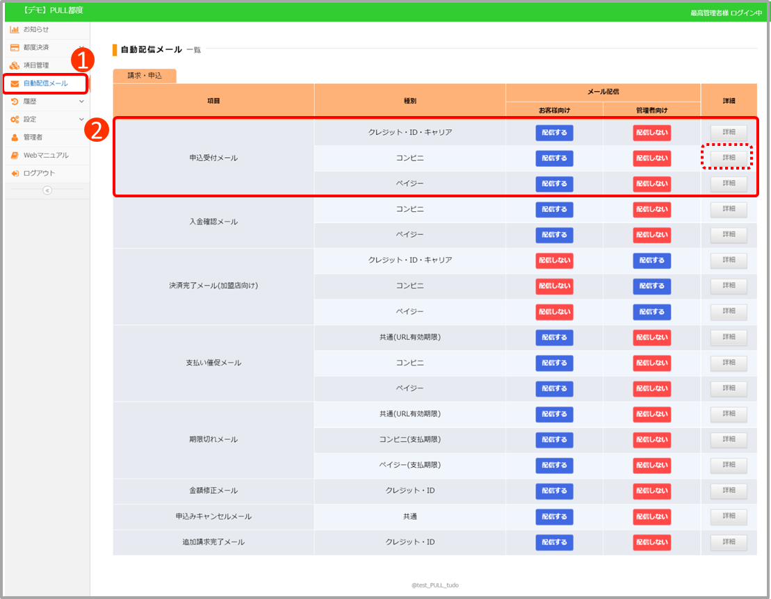 ①[自動配信メール]をクリック