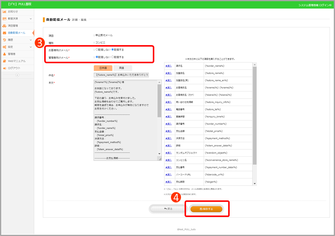 | 種別 | 編集中メールの対象決済種別の表示 [共通]は全ての決済種別に共通するメールを意味します。 |