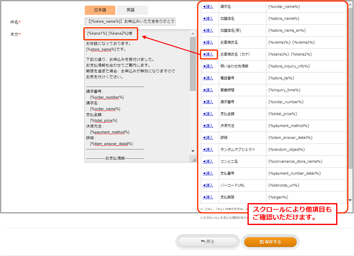 「お客様名(カナ)」 {%kana1%} {%kana2%}の可変項目を挿入