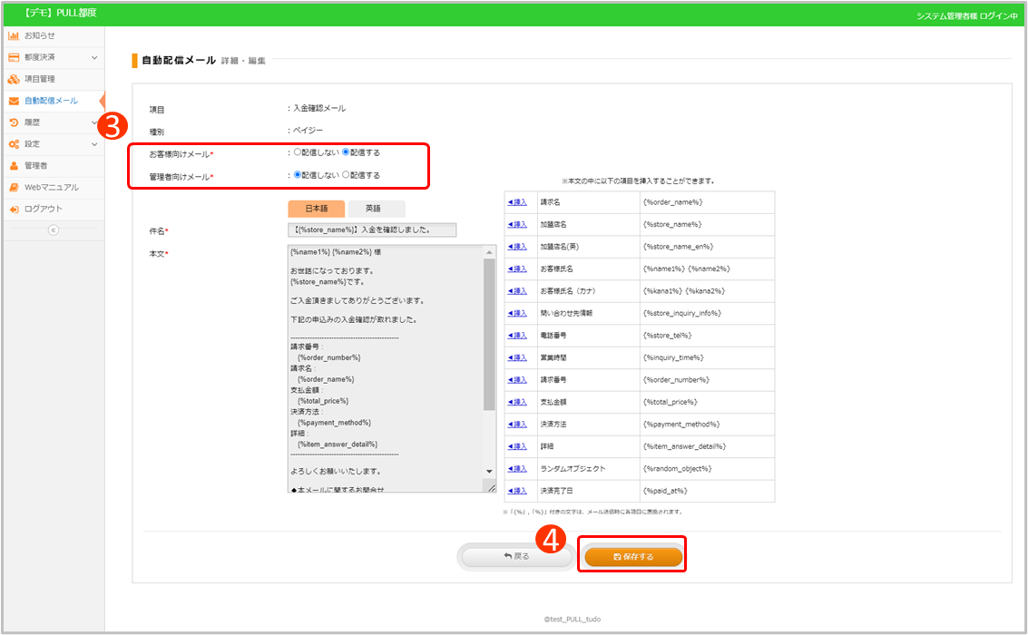 請求情報ごとの可変項目をメール本文に挿入することが可能です。