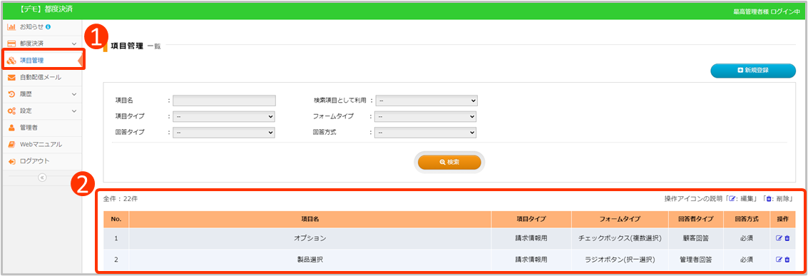 請求情報の項目を新たに作成すること、作成した項目の確認や編集が可能です。
