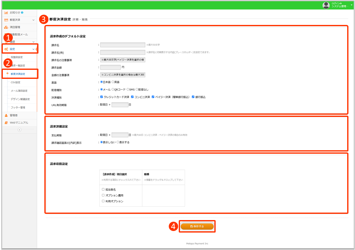都度決済におけるデフォルト設定の変更や初期値の設定が可能です。